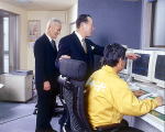 - 近畿・四国=「ACU21」集中監視、15年11ヵ月の偉業(写真=50万戸達成の報告を受け、管理センターに駆けつけた北嶋一郎社長(中央)と北嶋政次会長(左)