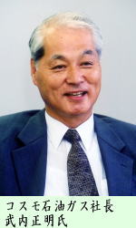 コスモ石油ガスの武内正明社長は昨年六月、社長に就任して一年余が経過した。社長に就任するまでの履歴は、京都大学大学院工学研究科博士課程を修了して昭和四十八年に丸善石油に入社、平成七年コスモ石油・本社技術部長、平成九年取締役千葉製油所長、平成十年常務取締役千葉製油所長、平成十二年常務取締役・研究開発部、技術部、安全環境部、購買センターを担当した。
