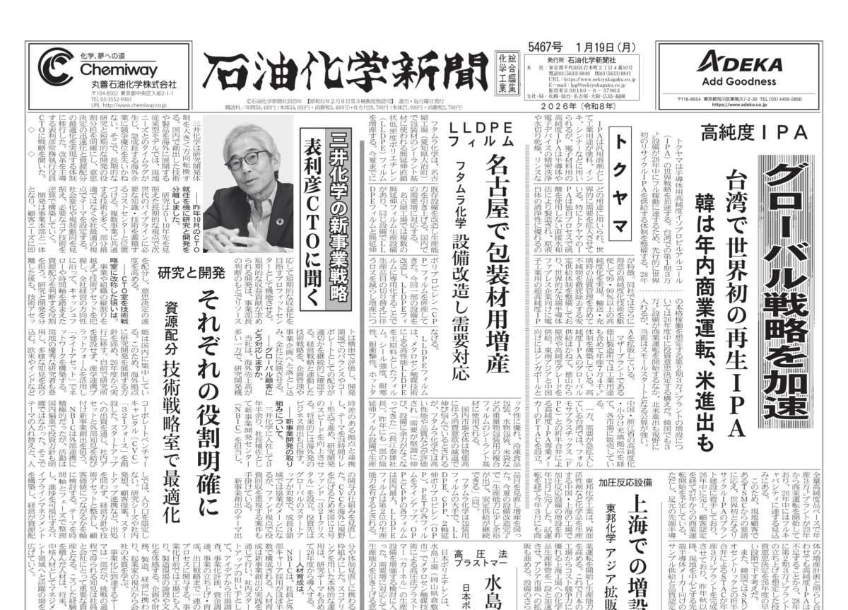 トクヤマは半導体用高純度イソプロピルアルコール(IPA)の世界戦略を加速する。台湾での第1期3万㌧設備が26年中にフル稼動に達するため、先行的に世界初のリサイクルIPAを供給する体制を整備する。28年の本格稼働を想定する第2期3万㌧プラントの増設については26年度中に投資意思決定する構えだ。韓国でも3万㌧設備が商業運転を開始するなか、北米進出も視野に入れるが、当面はスモールスタートとなる公算が強い。 - フタムラ化学・・・LLDPEフィルム、名古屋で包装材用増産 設備改造し需要対応