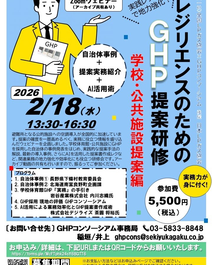 『レジリエンスのためのGHP提案研修 学校・公共施設提案編 』 主催:一般社団法人 全国LPガス協会 × GHPコンソーシアム 後援:日本LPガス協会 本研修は、災害時の避難所となる「学校体育館」や「公共施設」などへのGHP提案手法を学ぶウェビナーです。国の支援を受けて導入が加速する「避難所空調」の提案に役...