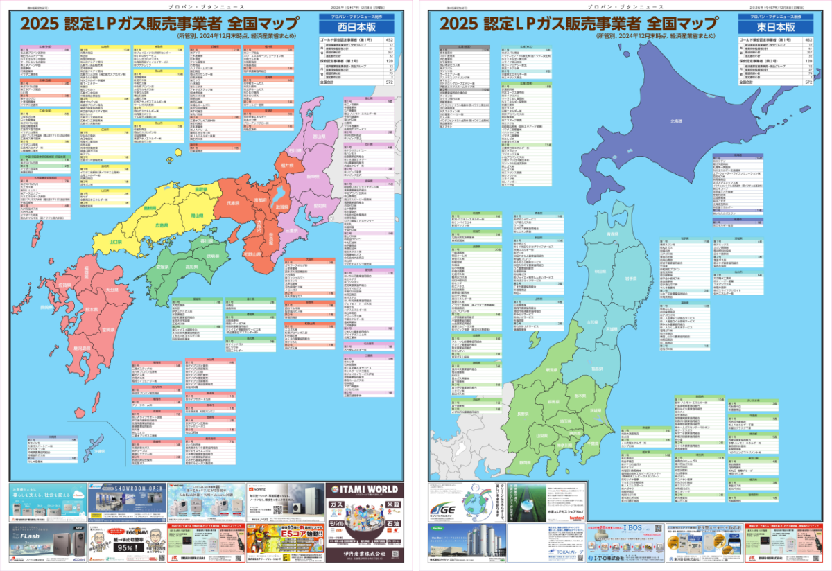 本紙は、読者サービスの一環で「情報・全国マップ」を不定期で発行しています。シリーズ第22弾は「認定LPガス販売事業者全国MAP編」です。 認定LPガス販売事業者を、経済産業省/各産業保安監督部/47都道府県別の一覧表を日本地図に沿って配置し、一目で認定販売事業者が確認できるようにしました。社内掲示や関係機関への配布にご活用下さい。 今週号と一緒に無料でお届けします。別途、必要な場合は1部770円(税込み、送料別)でご提供します。石油化学新聞社お申し込みはこちらから