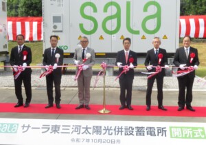 サーラエナジー(本社・豊橋市、鈴木敬太郎社長)写真は10月20日、豊橋市に完成したサーラ東三河太陽光併設蓄電所(略称:サーラ東三河蓄電所)の開所式を行った。同15日に開所式を行った「サーラ浜松蓄電所」に続く2カ所目の蓄電所建設プロジェクトとなる。電力系統からの充電に加えて、太陽光発電設備で発電した電力の蓄電も可能である。同社は需給調整市場を中心に供出することで電力の安定供給と新しい収益機会の創出を目指していく。【写真】㊤神野吾郎・サーラグループ代表(左から3番目)、鈴木敬太郎・サーラエナジー社長(左から2番目)らがテープカットを行った