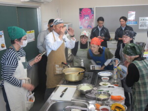 教室は2023年12月日下悦克支部長以来2年ぶりの実施で通算4回目。今回も参加者を募ったところ定員を超える応募があり、抽選で16人が選ばれた。講師はスープカレーの匠(たくみ)として知られるイデゴウ氏。同氏は道内外にスープカレー専門店「札幌らっきょ」を展開する一方で、スープカレーを広めようと精力的に教室を開いている。
