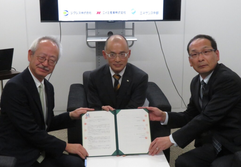 ジクシス(本社・東京、田中惠次社長)、ニイミ産業(同・春日井市、新美良夫社長)、エネサンス中部(同・愛知県蟹江町、田部克志社長)は12月15日、名古屋市のジクシス中部支店でLPガス配送合理化に向けた業務連携に関する基本合意調印式を行った。同支店の久保洋一支店長、ニイミ産業の新美社長、エネサンス中部の田部社長が基本合意書に調印。5月からの運用開始を目標に準備を進める。【写真】基本合意文書に調印した(左から)新美良夫・ニイミ産業社長、久保洋一・ジクシス中部支店長、田部克志・エネサンス中部社長