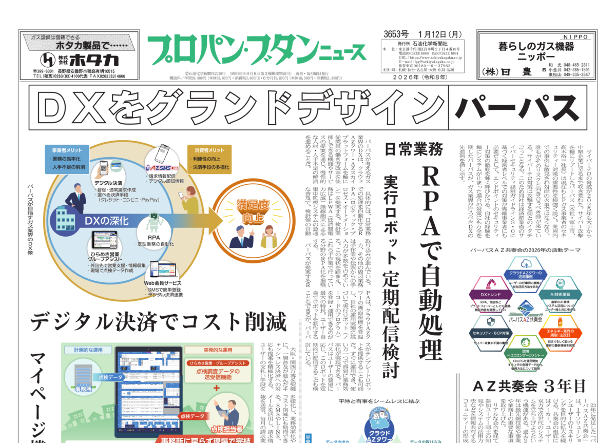 おことわり 12日付は2026年新年号第2弾の特別編集10㌻として発行しました。1面はITソリューション事業の提供を通じてガス事業者のDX実現を後押しするパーパスを特集。2~3面は総合版、4~5面は東日本版、6~7面は西日本版、8~9面は流通段階別の課題と展望(中央団体トップの年頭所感)、10面は住設版としました。次号(19日付)から通常編成でお届けします。  石油化学新聞社
