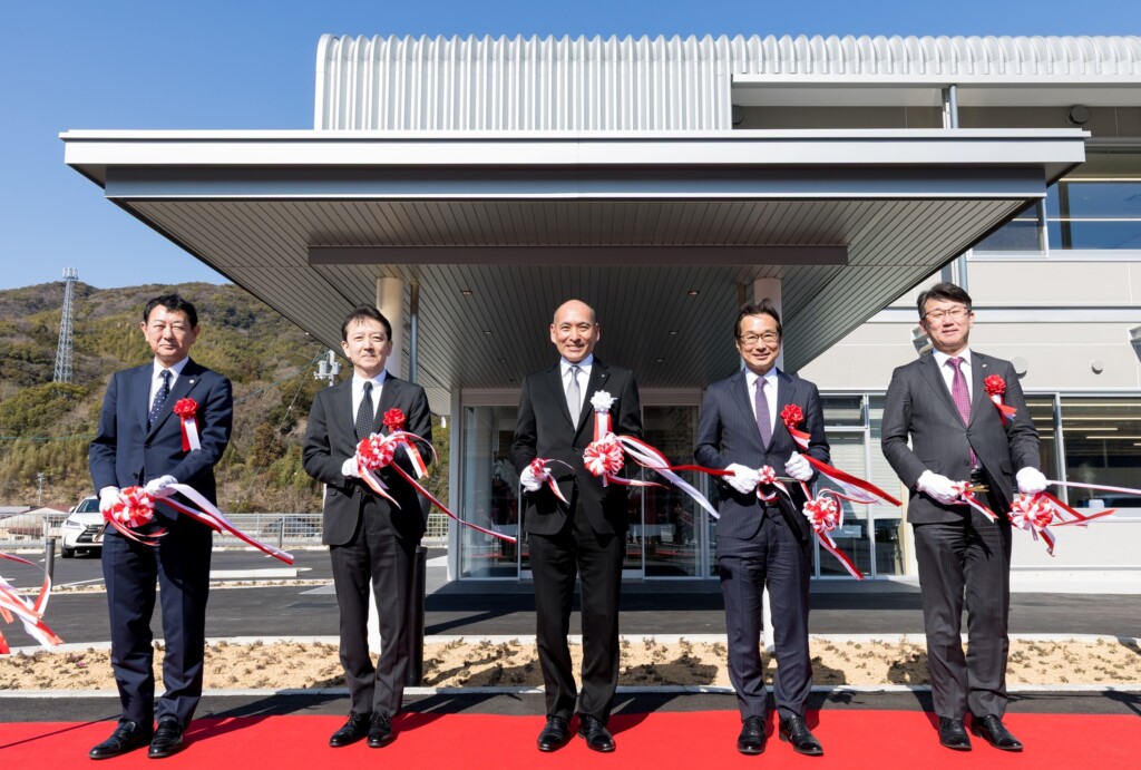 テープカットする(左から)阿部真・シェルルブリカンツジャパン社長、入交太郎・入交グループ本社社長、成岡祐輔社長、平野敦彦・出光興産副社長、牧野隆一郎・ジクシス常務執行役員