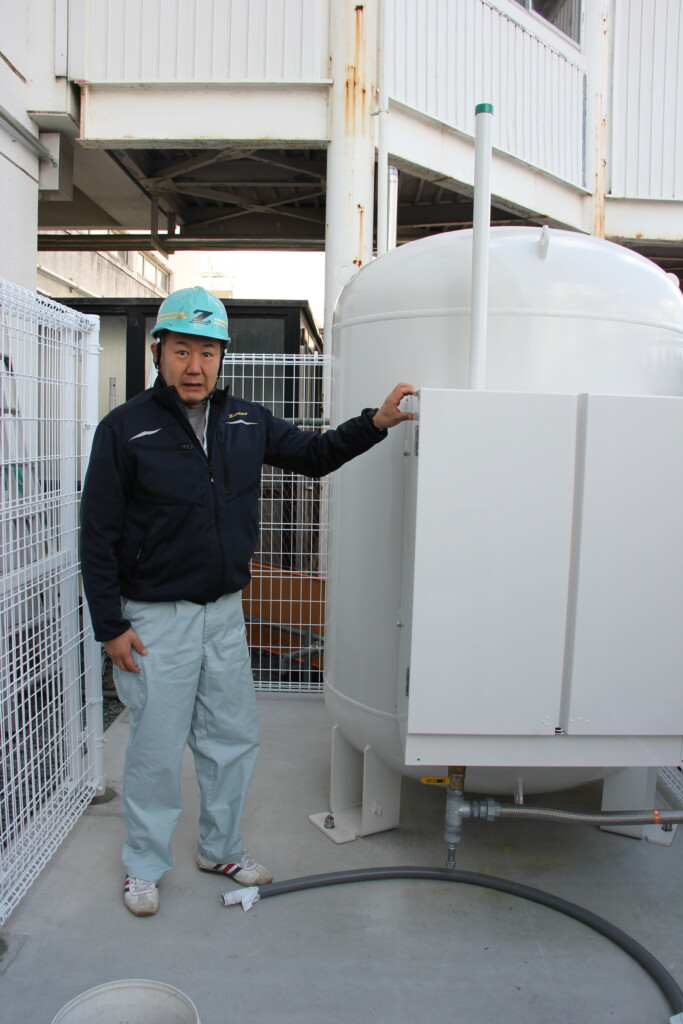 【写真】金谷中学校で工事を進める増田直輝社長と980㌔㌘災対バルク貯槽 同校はヤンマー製電源自立型GHP20馬力機4台を導入した