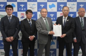 北海道LPガス協会(沼田常好会長)、同協石狩支部(田中明支部長)、同支部千歳分会(沼田哲平分会長)は、千歳市(横田隆一市長)に対し、公共施設などへのLPガス常設を要望した。16日、市役所を訪れた沼田会長は近年の自然災害多発を踏まえ、「分散型エネルギーであるLPガスの災害時におけるさまざまなメリットに注目してほしい」と訴えた。千歳市への陳情は初めて。【写真】横田隆一市長に要望書を手渡した(左から沼田哲平・千歳分会長、田中明・石狩支部長、沼田常好・道協会長、横田隆一・千歳市長、鈴木智哉道協専務理事)