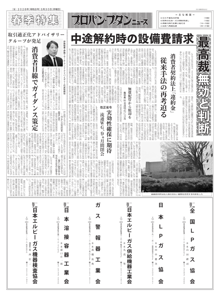 LPガス法改正省令は、2024年の過大な営業行為の制限、LPガス料金の情報提供に続き、25年4月2日に三部料金制の徹底が施行した。その後、LPガス流通ワーキンググループは開催されず、実効性の確保に向けた議論は進んでいないように見えるが、12月に二つの動きが注目を集めた。中途解約時に設備費用の支払いを求める条項を無効と判断した最高裁判所の判決と、甲元信宏燃料流通政策室長に助言を行うLPガス取引適正化アドバイザリーグループの設置だ。改正省令への対応は新たな局面を迎えている。