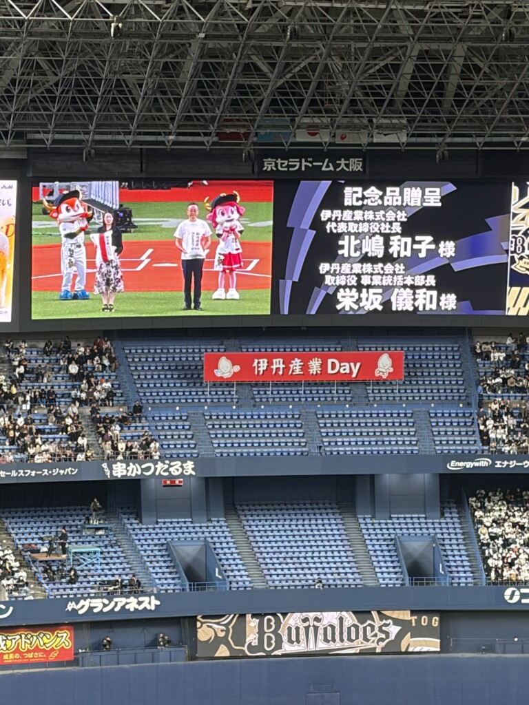 伊丹産業(本社・伊丹市、北嶋和子社長)は3月27日、大阪市の京セラドーム大阪で行われたプロ野球パ・リーグ開幕戦、オリックス・バファローズ対東北楽天ゴールデンイーグルス戦にゲームスポンサーとして協賛した。
