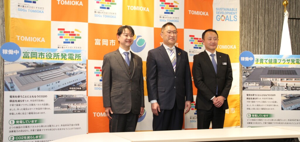 富岡市(榎本義法市長)は3月19日、エネクル(本社・草加市、宮本康正社長)とのPPA(電力販売契約)により、市管理施設に合計出力約140㌔㍗分の太陽光発電設備を導入したと発表した。市とエネクル親会社の堀川産業、東京ガスが2022年6月に締結したカーボンニュートラルシティ実現に向けた包括連携協定の一環。供給者であるエネクルが所有する設備を需要家である市の施設に設置して運転するオンサイトP P A 方式で、群馬県内自治体で初の事例となった。