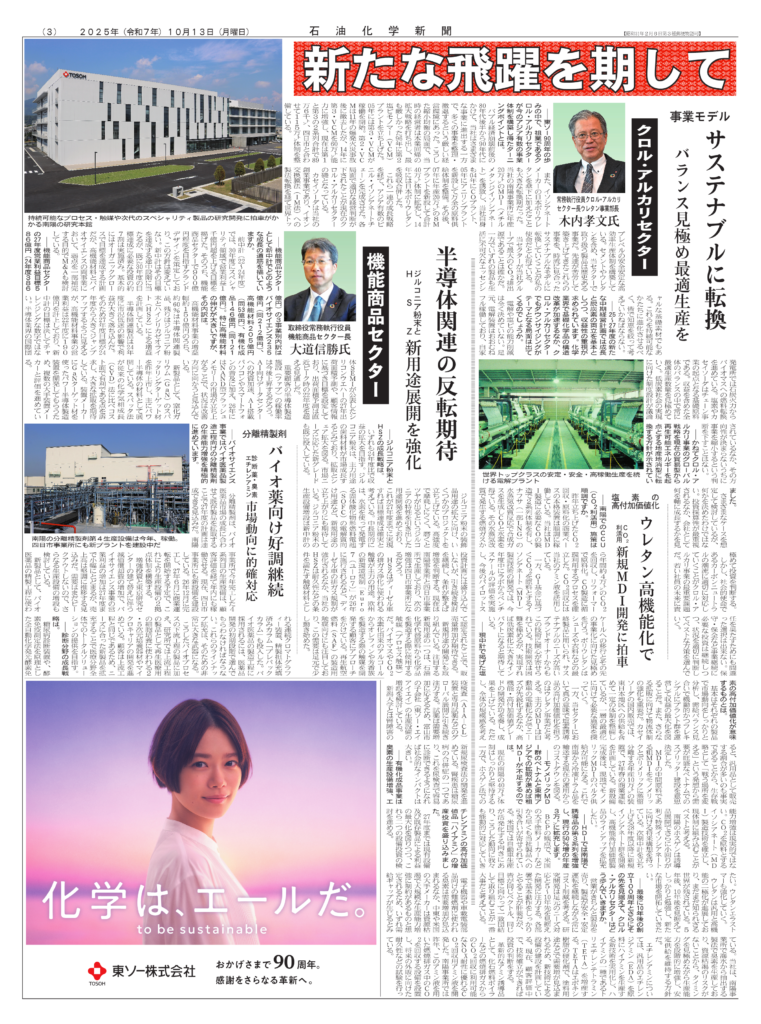 バブル経済崩壊前後の80年代後半から90年代にかけて、当社はさまざまな事業に進出する一方で、多くの事業を整理・撤退するという厳しい経営環境にあった。こうした縮小均衡の局面で、当時の経営者は本業回帰の拡大戦略を打ち出し、最も厳しかった96年に第2塩ビモノマー(VCM)プラントを立ち上げた。05年には第3・VCMが稼働を開始。第2・VCMは11年の爆発火災事故後に撤去したが、14年に第3・VCMを60万㌧能力に増強し、現在は第1と第3の2系列合計で89万6千㌧、四日市と合わせて115万㌧体制を整備している。 また、イソシアネートメーカーの日本ポリウレタンを傘下に加えたことも大きな転換期だった。当社の南陽事業所に年産20万㌧のMDI(メチルメタンジイソシアネート)を誘致し、当社自身も04年にCOプラント、05年にアニリンプラントを新設して万全の原料供給体制を整備。その後、07年に年産20万㌧の8Mプラントを新設して合計40万㌧体制に拡充し、14年には日本ポリウレタンを吸収合併した。 - 機能商品セクター 取締役常務執行役員機能商品セクター長 大道信勝氏