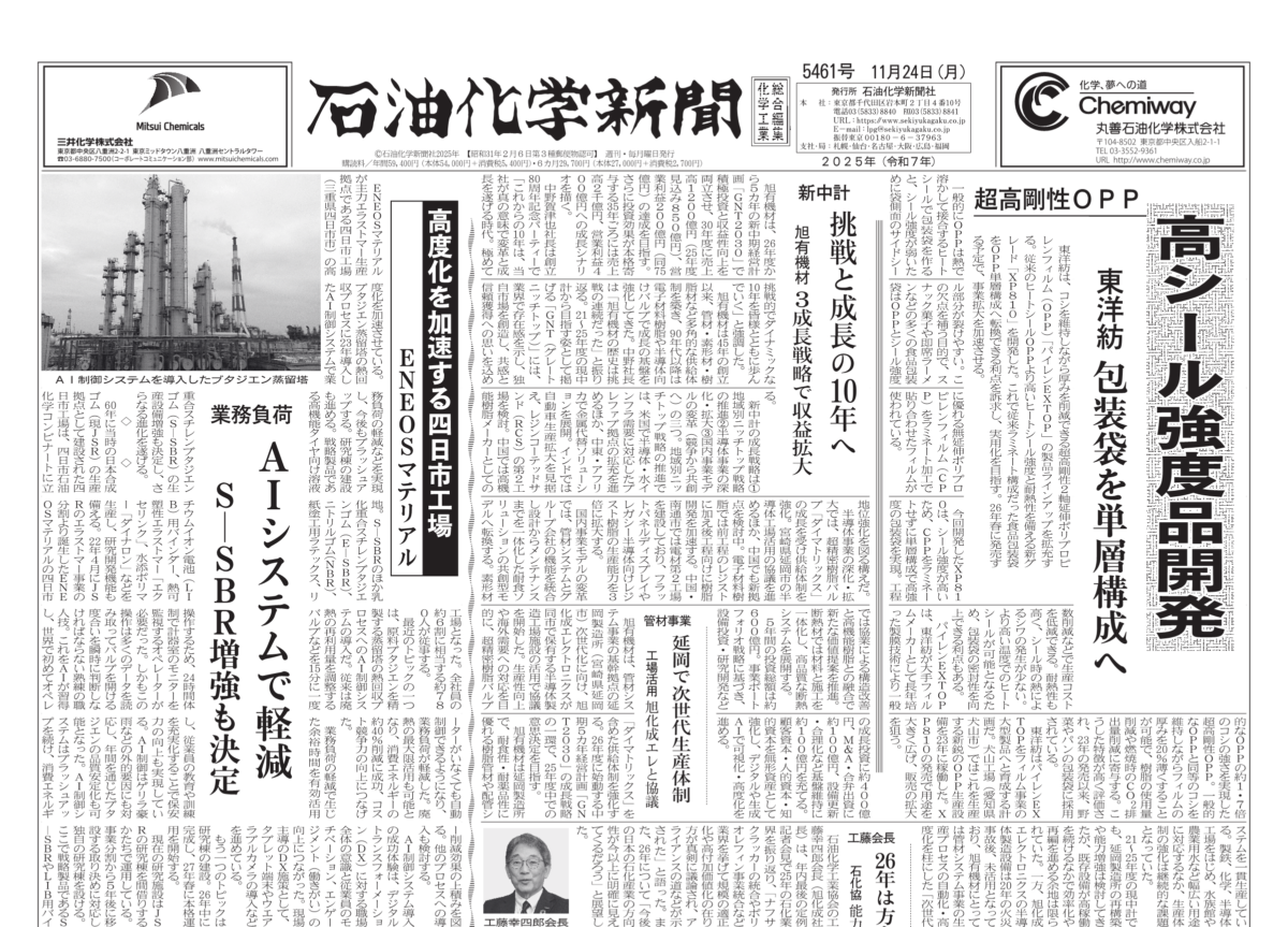 ENEOSマテリアルが主力エラストマー生産拠点である四日市工場(三重県四日市市)の高度化を加速させている。ブタジエン蒸留塔の熱回収プロセスに23年導入したAI制御システムで業務負荷の軽減などを実現し、今後もブラッシュアップする。研究棟の建設も進める。戦略製品である高機能タイヤ向け溶液重合スチレンブタジエンゴム(S―SBR)の生産設備増強も決定し、さらなる進化を遂げる。