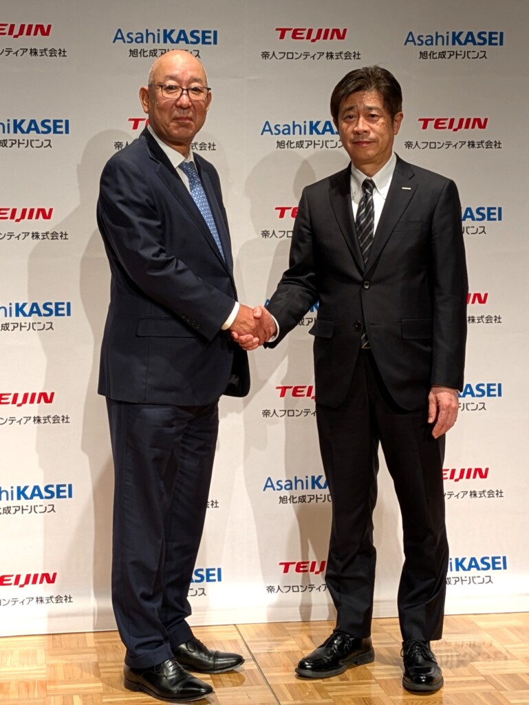 帝人フロンティアの平田恭成社長は経営統合を決めた背景について「国内アパレル市場規模はわずかながらも依然として縮小傾向にあり、商社を含む業界各社の事業撤退や統廃合が進み、気候変動や地政学リスクの高まりも相まって不確実性が増すなか、衣料繊維以外の産業資材や樹脂化学品といった事業領域の拡大とグローバル展開を加速させる必要性がより高まってきた」と指摘。「しかるべき先行投資をすることで業界のリーディングカンパニーとしての地位を確立できる機会が到来した」と強調した。【写真】握手する帝人フロンティアの平田恭成社長(左)と旭化成アドバンスの春見恵司社長 - 三井化学・・・C M F強化PP、車材料に