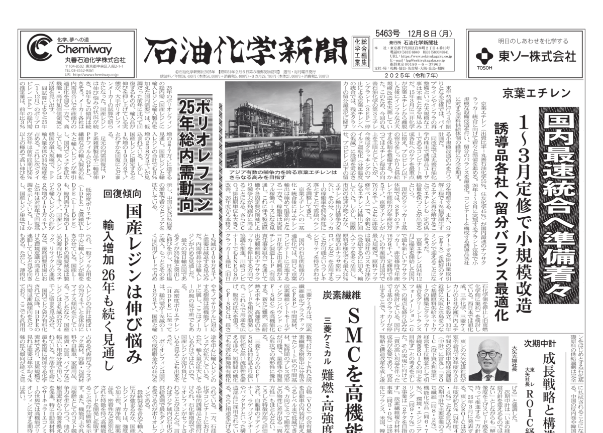 京葉エチレン(出資比率=丸善石油化学55%、住友化学45%)が国内最速のナフサクラッカー統合に向けて着々と準備を進める。26年1~3月に実施するプラント定修で小規模な設備改造を行い、留分のバランスを最適化。コンビナートを構成する誘導品各社に対する原料供給体制の維持に万全を期す。 - ポリオレフィン25年総内需動向