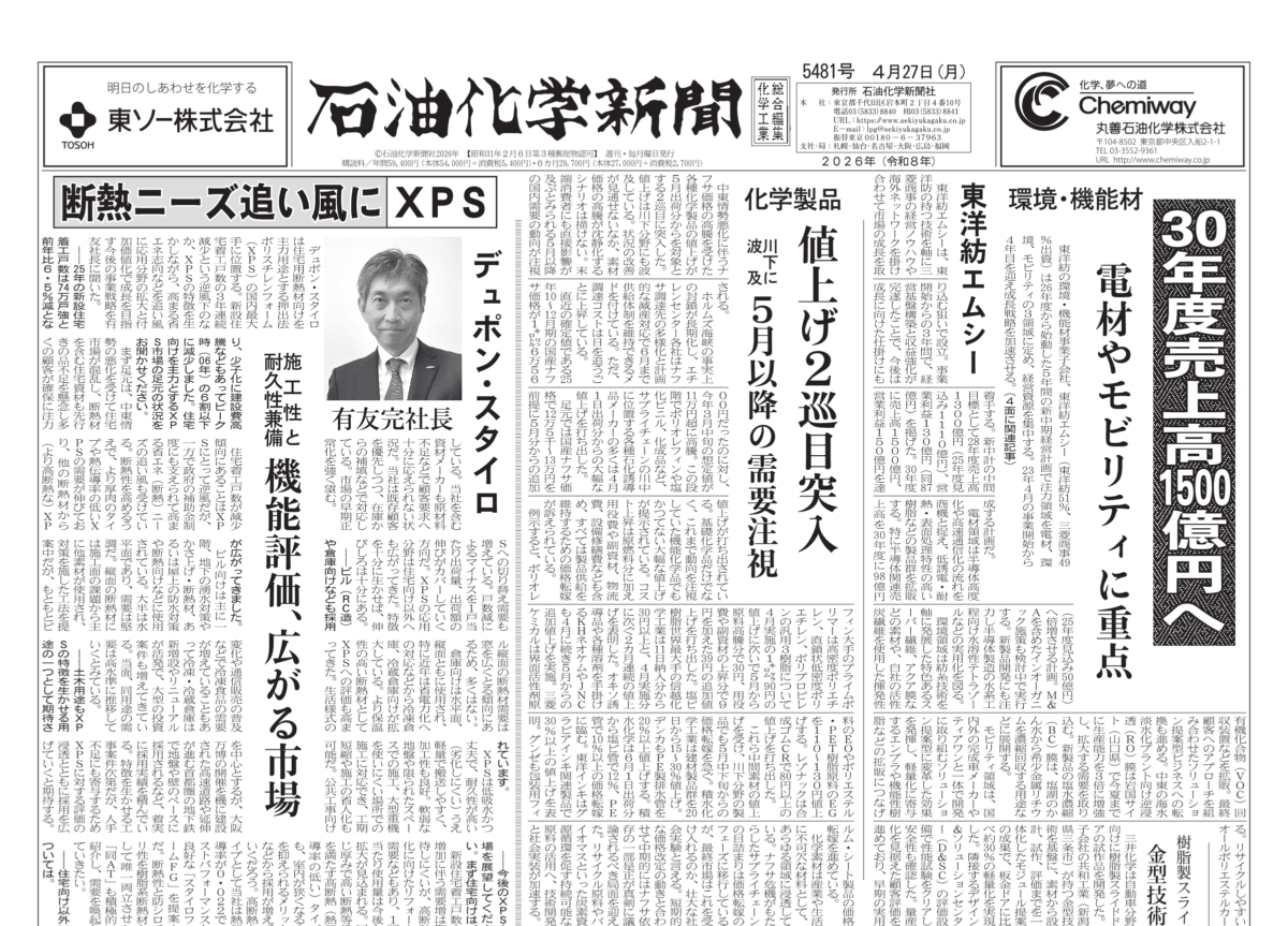 東洋紡の環境・機能材事業子会社、東洋紡エムシー(東洋紡51%、三菱商事49%出資)は26年度から始動した5年間の新中期経営計画で注力領域を電材、環境、モビリティの3領域に定め、経営資源を集中する。23年4月の事業開始から4年目を迎え成長戦略を加速させる。(4面に関連記事) - 化学製品値上げ・・・2巡目突入 川下に波及 5月以降の需要注視