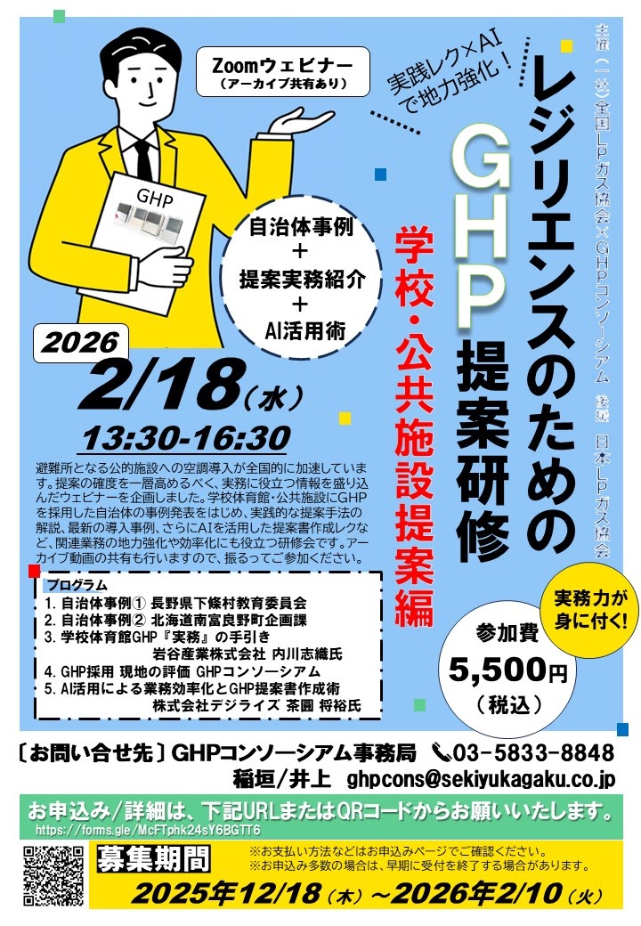 「GHPを導入した自治体の生の声」や「全国各地で提案実績を重ねた実務者による提案手法の解説」、「AIによる業務効率化事例」、「AIを活用したGHP提案書作成実演」など、多角的な切り口でLPガス販売事業者・関連企業・関連機器メーカー等の実務力向上をご支援する内容です。